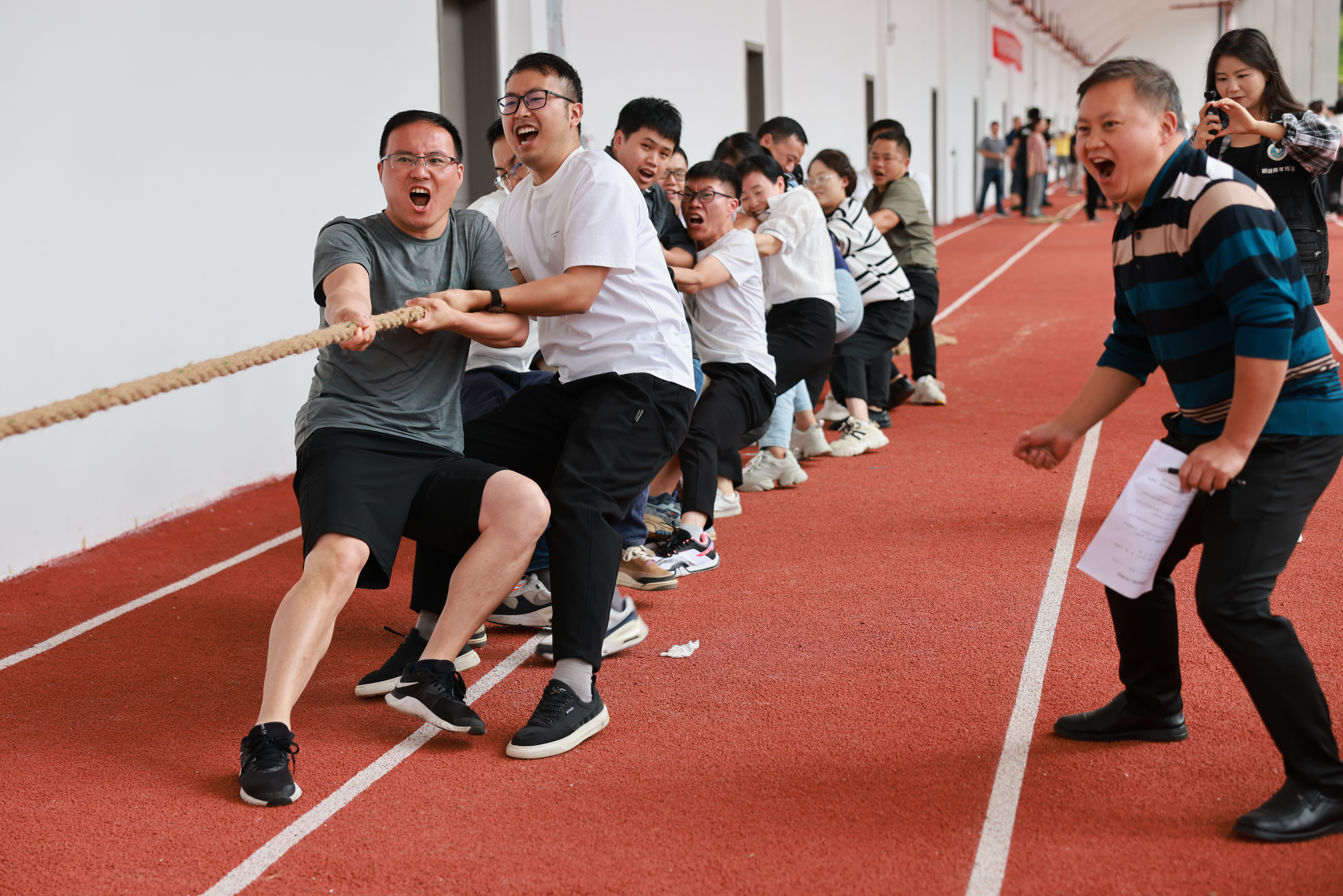 随着裁判员的一声哨响,紧张激烈的拔河比赛正式开始。赛场上,各参赛队员紧紧握住长绳,紧咬牙关、全力以赴地奋力拼搏。观赛老师们情绪激昂,加油声、欢呼声此起彼伏,现场热烈欢腾。