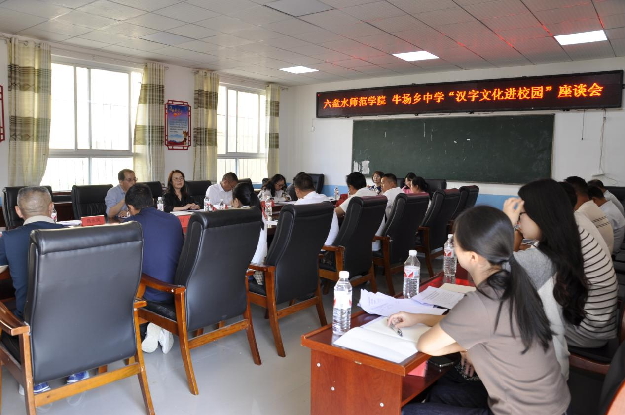 9月14日,bat365在线中国登录入口文学与新闻学院工会赴六枝特区牛场乡中学联合开展“汉字文化进校园”主题活动。bat365在线中国登录入口副校长费虹、文学与新闻学院党委书记龙尚国,六盘水市美术家协会副主席熊定才,牛场乡党委书记黄美焦,牛场中心校校长龙鹏、牛场乡中学副校长刘海燕等出席座谈会。