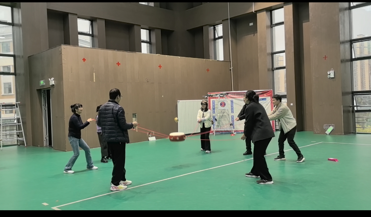 同心鼓活动考验着团队成员之间的默契与协作能力。教职工们分成若干小组,每人手持一根绳子,共同控制鼓面来颠球。活动过程中,大家喊着整齐的口号,眼神专注,步伐一致,随着球的起落不断调整力度和节奏。每一次成功的颠球都引来欢呼声,失误也不气馁,而是迅速调整状态继续挑战。通过这个活动,教职工们深刻体会到团结协作的重要性,只有心往一处想、劲往一处使,才能实现共同的目标。