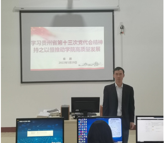 5月19日下午,计算机科学学院在智学楼实训室6举行学习贯彻贵州省第十三次党代会精神宣讲报告会,学院党委副书记秦鹏作了主题为“学习贵州省第十三次党代会精神 持之以恒推动学院高质量发展”的宣讲报告,学院2019级学生代表,全体入党积极分子参加了宣讲会。