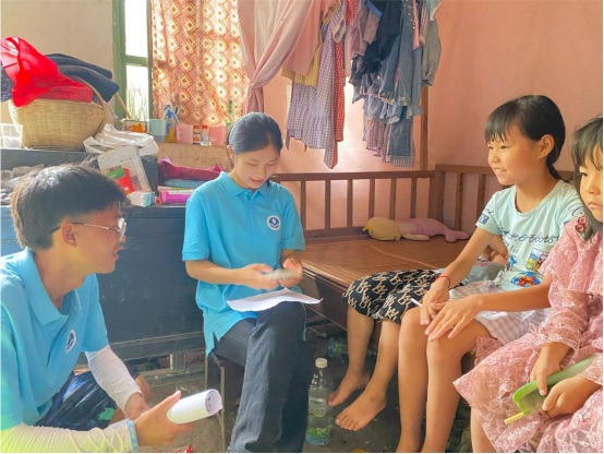 调研团队的队员们通过和小朋友聊天、填写问卷调查等方式来了解留守儿童的基本情况并帮助他们解决实际困难。在聊天中,与小朋友畅谈学习、生活和未来,帮助他们树立理想、信念和追求以及克服空虚、孤独,树立健全的人格。同时也对他们进行假期作业辅导和宣传如防火防盗、防溺水、防电信诈骗等安全知识。最后送上礼物并叮嘱留守儿童监护人加强与孩子的沟通,让孩子感受亲情的温暖,帮助孩子健康成长,加强父母与孩子的交流,勤打电话、视频通话等,让父母与孩子多联系,来弥补缺失的陪伴和关爱。