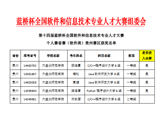 近日,第十四届“蓝桥杯”全国软件和信息技术专业人才大赛个人赛省赛(软件类)贵州赛区比赛获奖名单揭晓,计算机科学学院顾佳豪、梁佳营、梅松、黄健4名同学荣获一等奖,何秋蓉同学获二等奖。bat365荣获第十四届“蓝桥杯”全国软件和信息技术专业人才大赛个人赛省赛(软件类)“优胜学校奖”。获得一等奖的4名同学将代表学校参加第十四届“蓝桥杯”全国软件和信息技术专业人才大赛(个人赛)全国总决赛。