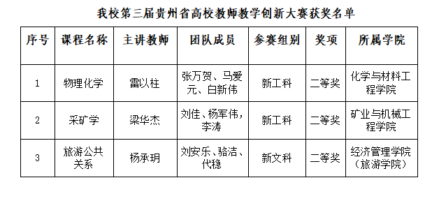 近日,根据第三届贵州省高校教师教学创新大赛组委会“关于公布第三届贵州省高校教师教学创新大赛获奖名单的通知”,bat365雷以柱教授、梁华杰教授和杨承玥副教授3名教师团队分获新工科二等奖、新工科二等奖和新文科二等奖。较上一届教师教学创新大赛取得新突破。