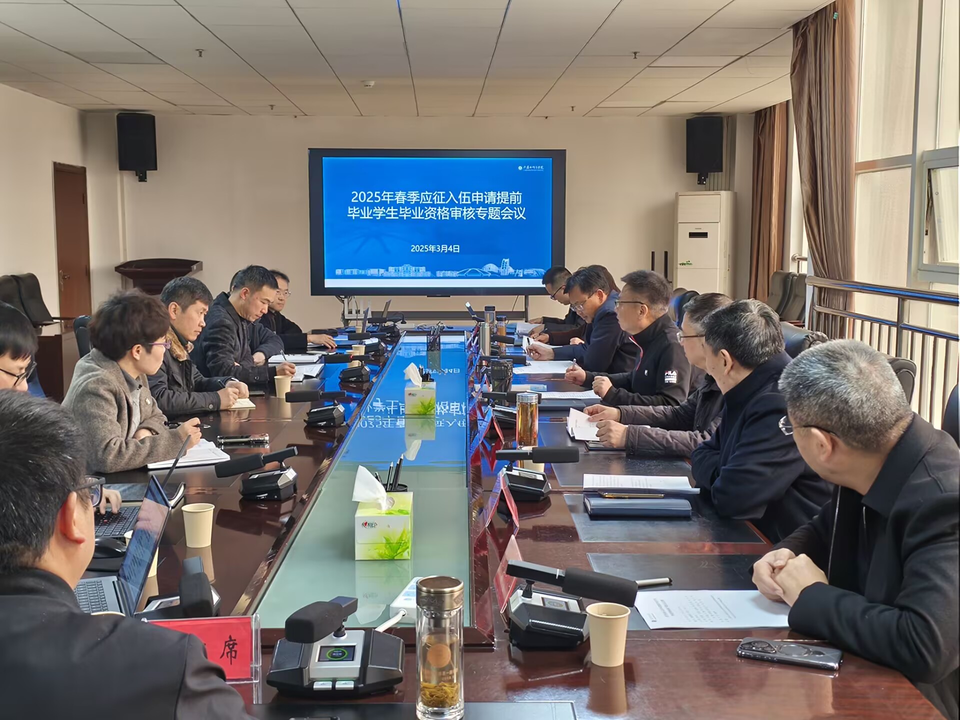 会上,教务处处长代稳汇报了2025年春季应征入伍申请提前毕业学生毕业资格审核情况,与会人员对学生毕业资格相关事宜进行审议。