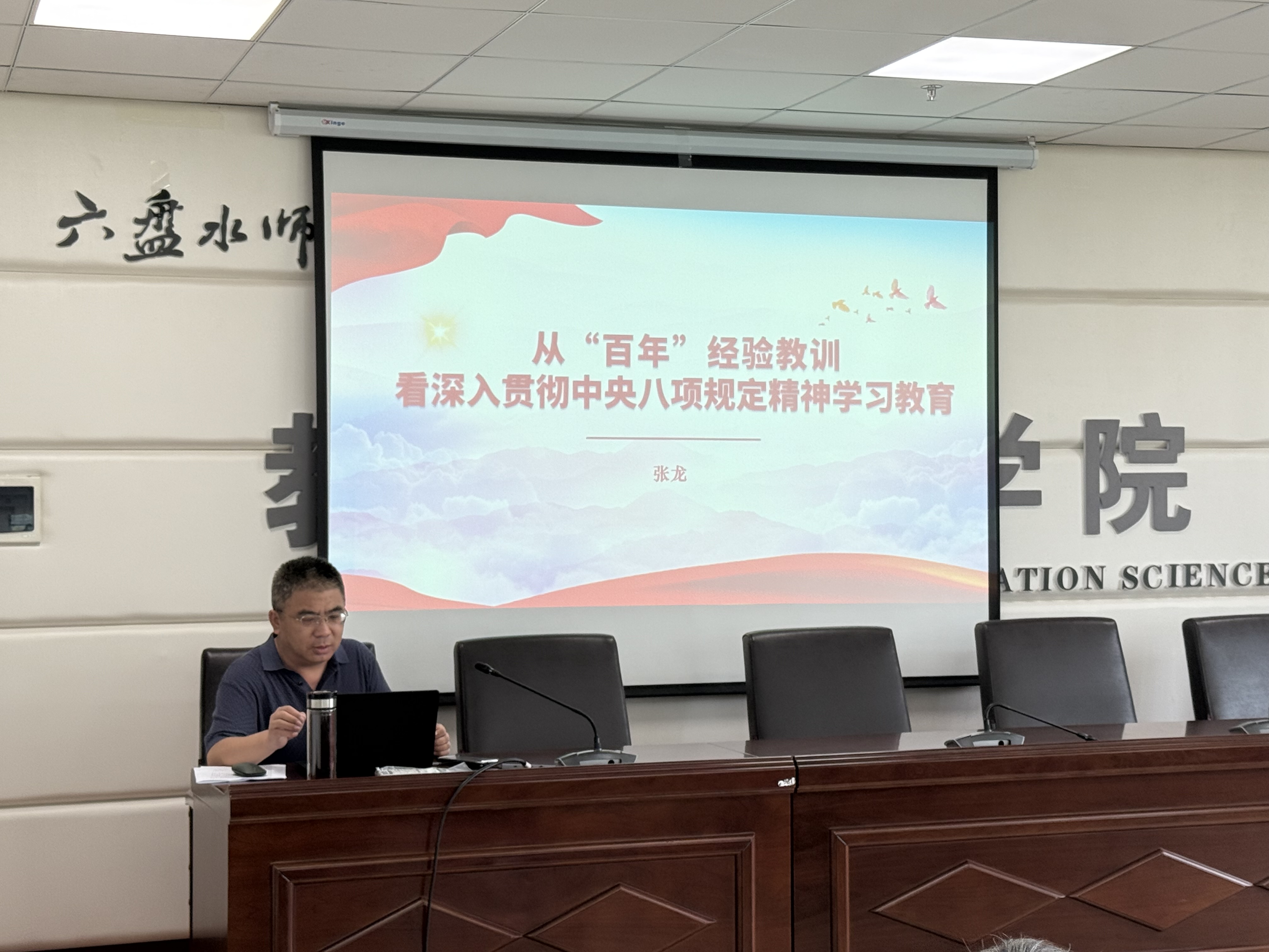 7月18日,学校党委委员、副校长张龙在奥学楼401会议室讲授《从“百年”经验教训看深入贯彻中央八项规定精神学习教育》专题党课,体育学院领导班子、艺术学院领导班子、教育科学学院教工党支部、教务处全体党员参加学习。