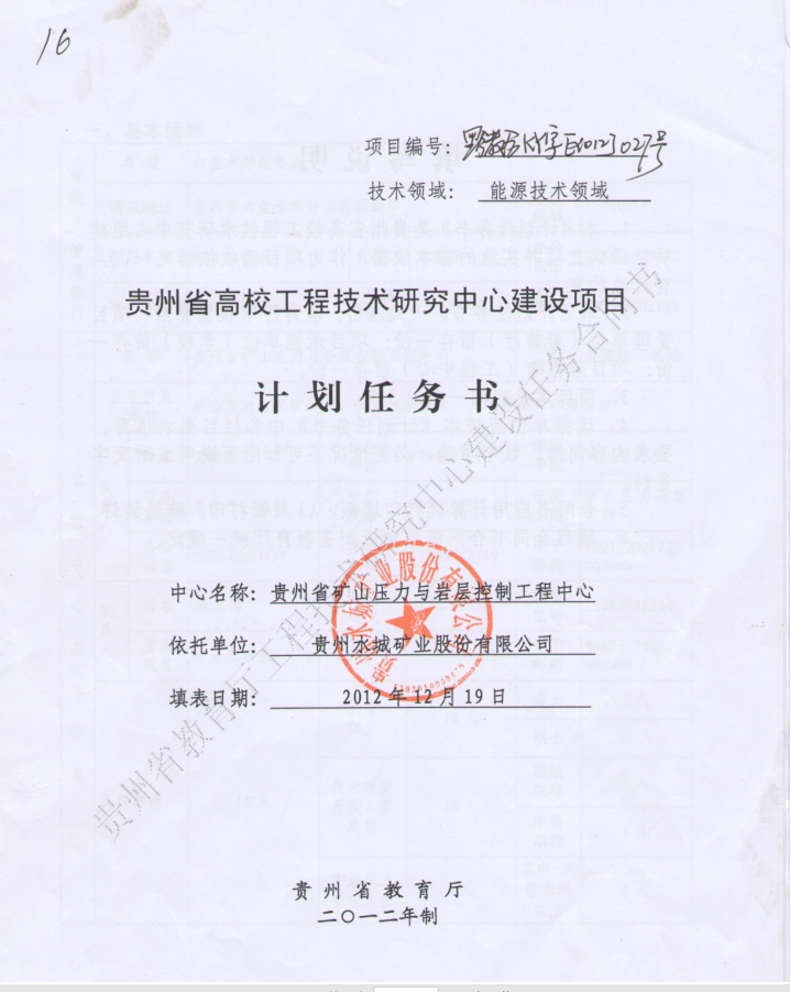 贵州省矿山压力与岩层控制工程中心,贵州省教育厅,2012