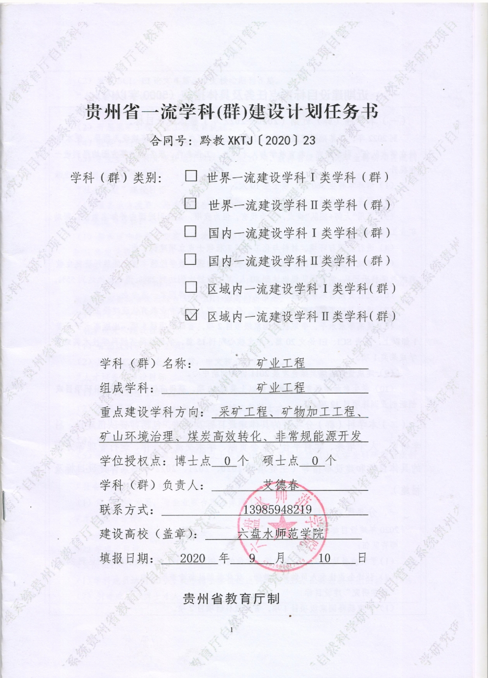 贵州省区域内矿业工程一流建设Ⅱ类学科,贵州省教育厅,2020