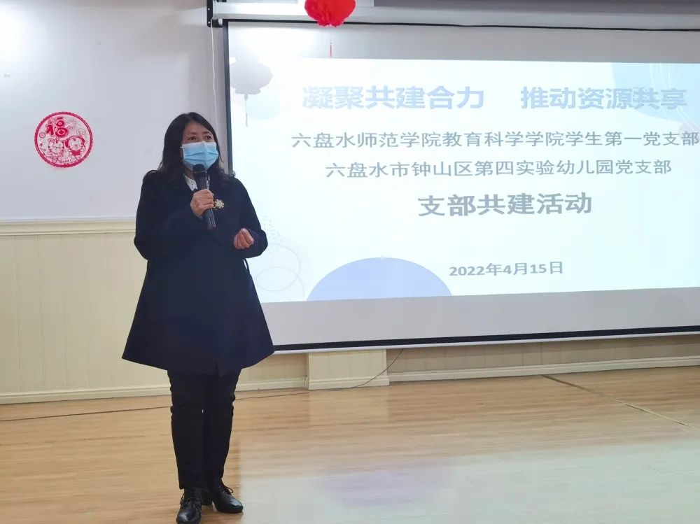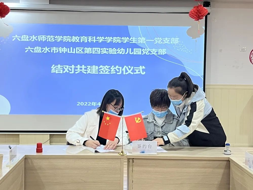 李扶卿从幼儿园发展历程、办园思想、办园宗旨、办园理念等方面介绍了幼儿园基本情况。她提出要以本次活动为抓手,做到凝聚共建合力,推动幼儿园与高校之间的资源共享。钟山区第四实验幼儿园王丽老师宣读了本次共建结对实施方案,她对指导思想、目标任务、双方协作共建内容及方式、具体要求进行了宣读。随后,教育科学学院学生第一党支部与六盘水市钟山区第四实验幼儿园党支部共同签署支部结对共建协议书。