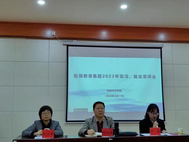 5月17日下午,教育科学学院在乐学楼第三阶梯教室举办乾瑞教育集团2022年实习、就业宣讲会。教育科学学院副院长刘兴荣、乾瑞教育集团总经理刘宗福、幼教机构管理中心主任刘惠出席宣讲会,学前教育专业2019级、2018级部分学生,体育学院、艺术学院部分学生参会。本次宣讲会由教育科学学院党委副书记邓薇主持。