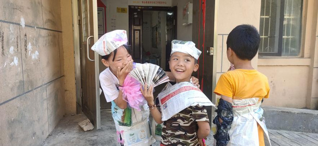 设计课上,孩子们使用生活中常见废品,如旧报纸、垃圾袋、旧纸壳、旧毛线等进行搭配改造。孩子们团结合作、相互配合,最终设计出了“凯士装”、“西域装”、“苗族装”等形式多样的作品,并且进行了T台走秀展示设计成果。