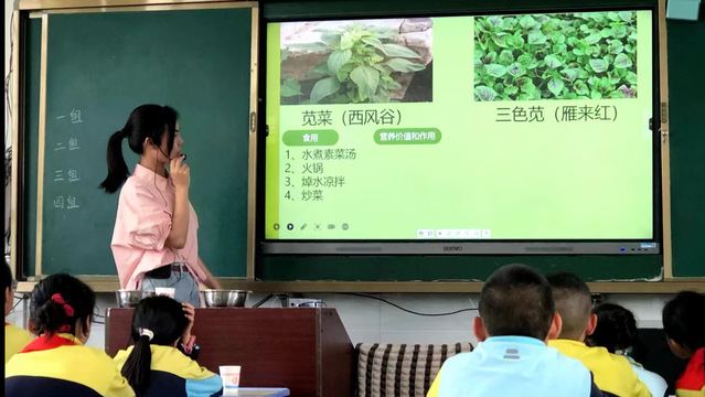 课堂上,志愿者利用多媒体技术和实物展示,向学生们介绍了蕨菜、马兰、苋菜、鼠曲草、艾草等常见野菜。学生们对这些生活中常见的植物表现出浓厚兴趣,纷纷举手提问,志愿者们耐心地解答,并分享了这些野菜的生长习性以及食用注意事项。同时,志愿者们还详细讲解了野菜的营养价值,如如蕨菜富含维生素和矿物质,可以增强免疫力;马兰具有清热解毒的功效,可以预防感冒;苋菜对心血管健康有益。引导他们了解膳食多样性的重要性,培养学生们健康饮食的意识。