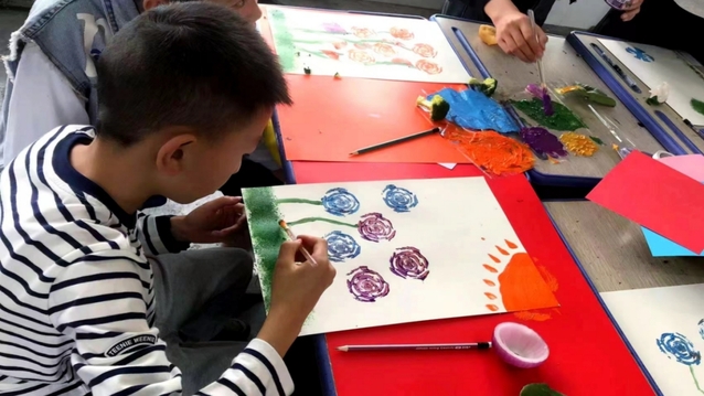 趣味游戏结束后,一场别具一格的食品拓印画教学也拉开了帷幕。志愿者们将学生分成四个小组,并发放蔬菜、纸张、颜料等教学工具。首先,志愿者介绍食品拓印画的基本概念,并播放两个小视频,让学生们直观感受制作过程,视频中的画面生动有趣,瞬间吸引了同学们的注意力,激发了他们的好奇心和创作欲望。随后,志愿者讲解并示范制作步骤:先将颜料均匀涂满食物有纹理的一面,再将食物轻轻按压在纸上,使其纹理和形状印在纸面上,最后组合装饰形成作品,学生们聚精会神地看着志愿者的示范,眼睛里充满了期待和跃跃欲试的光芒,学生们依照志愿者的步骤下,都独立完成了各自的作品,并将以组内评选的方式,选出了最优作品。