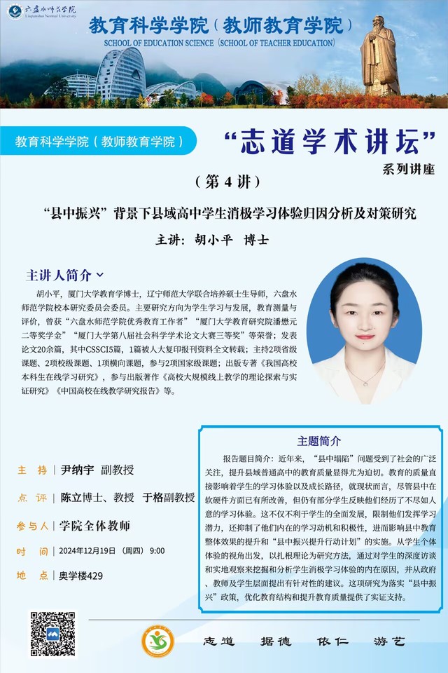 【预告】教育科学学院“志道学术讲坛”系列讲座第4讲------“县中振兴”背景下县域高中学生消极学习体验归因分析及对策研究
