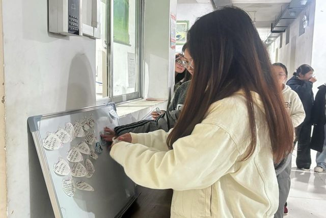在学生公寓的走廊里,学生们正专注地将写满心意的爱心便利贴贴在展示板上,展板上已错落贴好不少同款便利贴——这正是活动中的一幕,学生们以这种方式,将对宿管阿姨的感谢与祝福具象化为温馨的文字,让宿舍公共空间里漫开了双向奔赴的暖意。