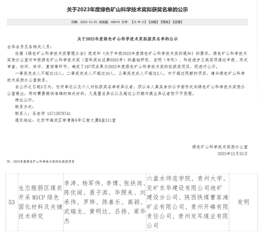 年度绿色矿山科学技术奖二等奖、中国安全生产协会安全科技进步奖三等奖等