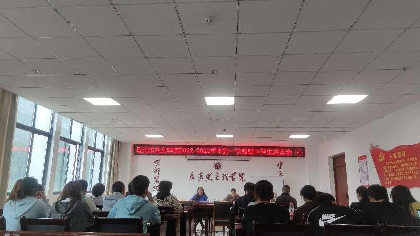 为进一步了解教师的教学情况和学生的学习情况,改进教学与管理中存在的问题与不足,进一步优化思想政治理论课的教学设计、实施过程,不断提升教学效果,推进思政理论课高质量开展,10月21日下午,马克思主义学院2022—2023学年第一学期思想政治理论课期中学生座谈会在奥学楼1008会议室召开。学院党委书记何天栩、党委副书记蔡娟,学院督导组组长许南海教授,督导组成员张勇教授、朱亭烨副教授,马克思主义基本原理教研室主任杨娟,教学科研管理科负责人陈门赞,以及教学科研管理科老师姚自文、王金等出席了此次座谈会会议,各二级学院学生代表约30人参加了此次座谈会。会议由党委书记何天栩主持。