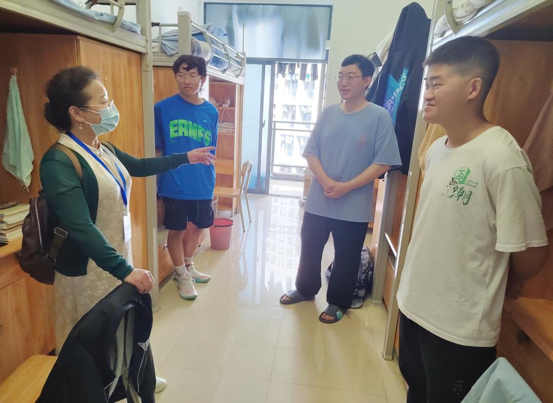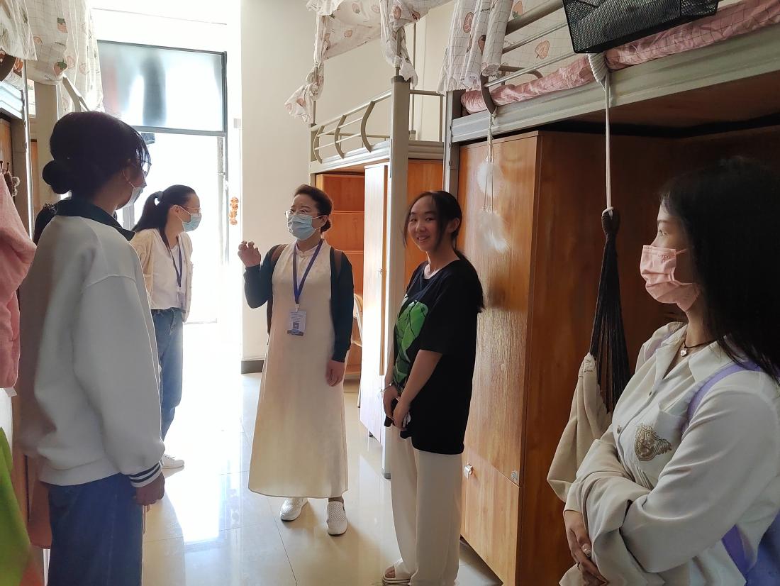 伍友琴来到寝室,了解同学们的适应情况,亲切地问候同学们:“你们来自哪儿?”“你们在这里有什么不适应的吗?”“在学习上有什么困难吗?”“如果有什么困难和班长反馈,学院会帮助解决。”这些无微不至的问候让同学们感受到了如家人般的关怀。接着她语重心长地告诉同学们要转变学习方式,做好学业规划,一步一个脚印地走下去,向着考研的目标努力奋斗。现在疫情形势严峻,提醒同学们继续做好疫情防控,共同打赢这场抗疫战,尽量做到少网购、少出校,在公共场所一定要佩戴好口罩;做好个人防护与卫生,个人物品要分类整理,保持整洁,营造一个舒适的寝室环境;在学好专业知识的同时,要积极锻炼,做到学习与锻炼两不误,把自己的时间合理安排,多学本领,度过充实而快乐的大学四年。