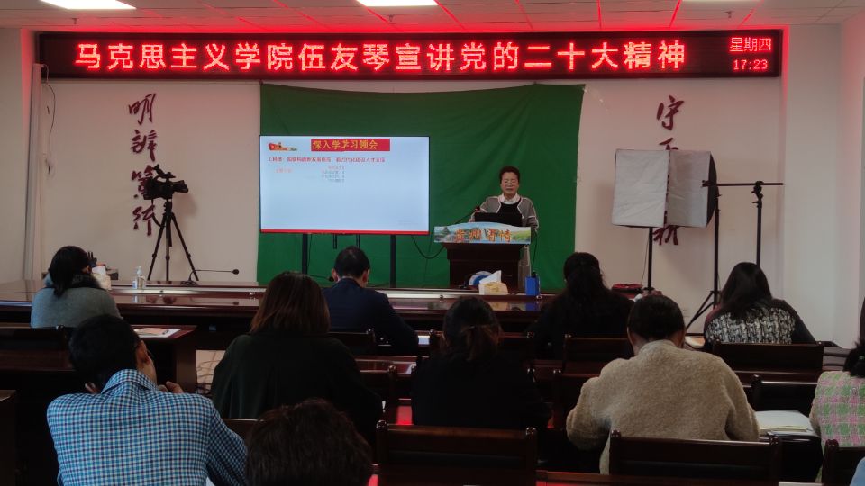 11月17日下午,马克思主义学院院长伍友琴教授在奥学楼1008会议室向全院教职工宣讲党的二十大精神。马克思主义学院党委书记何天栩、副书记蔡娟、副院长张绪清出席宣讲会,马克思主义学院全体教职工现场参加宣讲会。