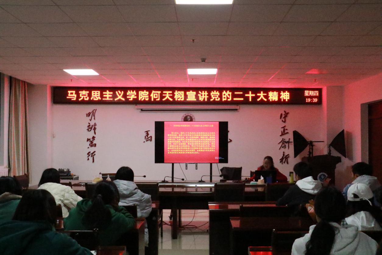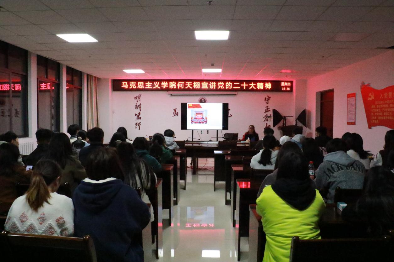 11月24日晚,马克思主义学院党委书记何天栩在奥学楼1008会议室向学生宣讲党的二十大精神。马克思主义学院全体入党积极分子、思想政治教育专业2020级全体学生到场聆听。何天栩还结合学生的实际,要求同学们在大学期间做好人生规划,练就过硬本领,切实担负起时代责任,为全面建设社会主义现代化国家的伟大事业贡献青春力量。