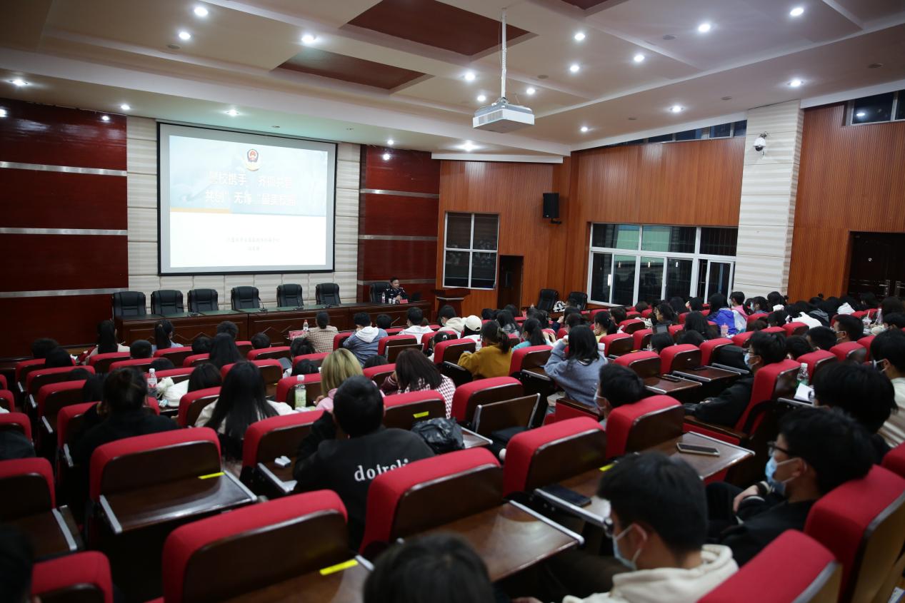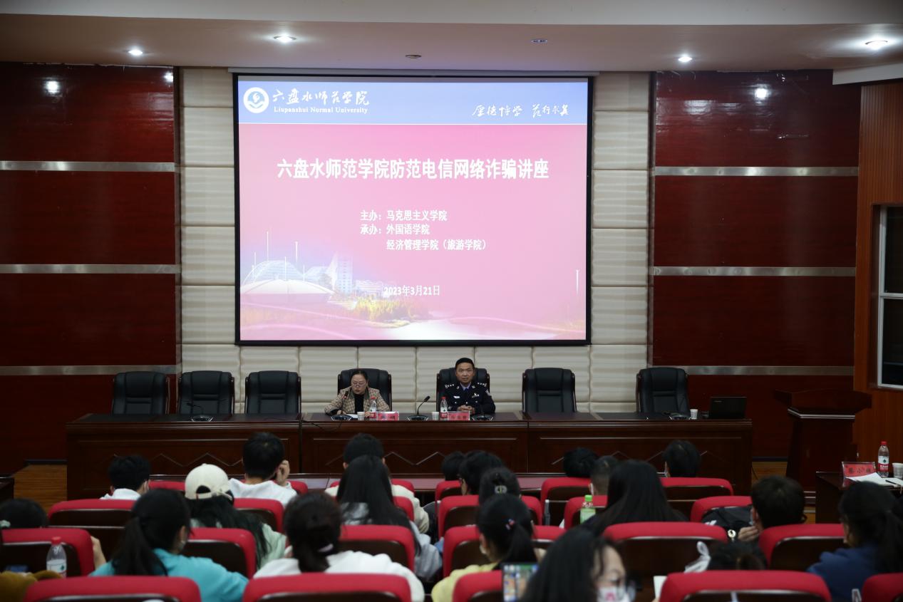 为做好防范电信网络诈骗,3月21日晚,由马克思主义学院主办,外国语学院、经济管理学院(旅游学院)协办的“警校携手 齐抓共管,共创‘无诈’最美校园”主题讲座在博学楼知行讲堂(117教室)举行,六盘水市公安局反诈中心冯思静大队长担任主讲。共250多名同学到场聆听,讲座由马克思主义学院党委副书记蔡娟主持。