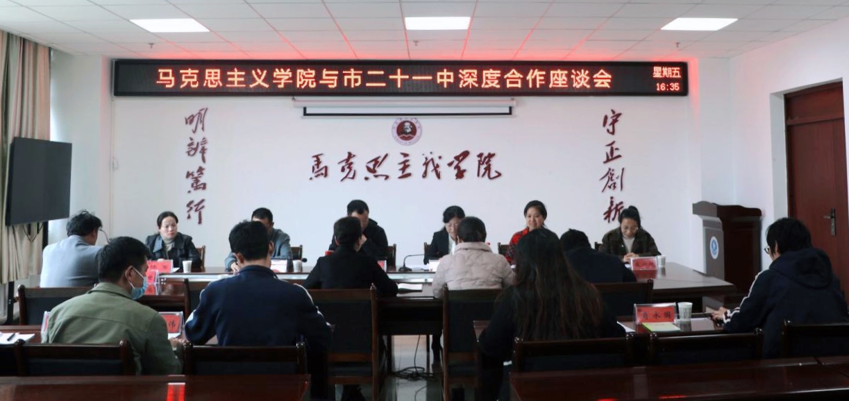 3月24日下午,马克思主义学院与实习基地校市二十一中深度合作座谈会在奥学楼十楼1008会议室召开。六盘水市第二十一中学校长孟强、副校长张宏,初中道德与法治学科教研组组长张白果、学科教师崔新艳、陈芳等6人,马克思主义学院院长伍友琴教授、副院长张绪清教授、思想政治教育系主任刘春燕、副主任张玉秀以及思想政治教育系麻友世博士、杨晋博士等教师代表出席此次座谈会。会议由伍友琴主持。