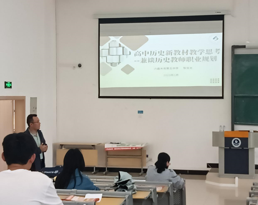 为切实增强历史学师范生的师德涵养、专业素养和教育教学实践能力,确保教育实习取得良好成效,引导师范生树立职业发展意识,5月25日下午,历史学系特邀六盘水市第五中学历史教师张宝允老师在勤学楼201教室开展“高中历史新教材教学思考---兼历史教师职业规划”专题讲座。马克思主义学院历史学专业2020级、2021级全体同学聆听了本次讲座,讲座由历史学系系主任花琦主持。