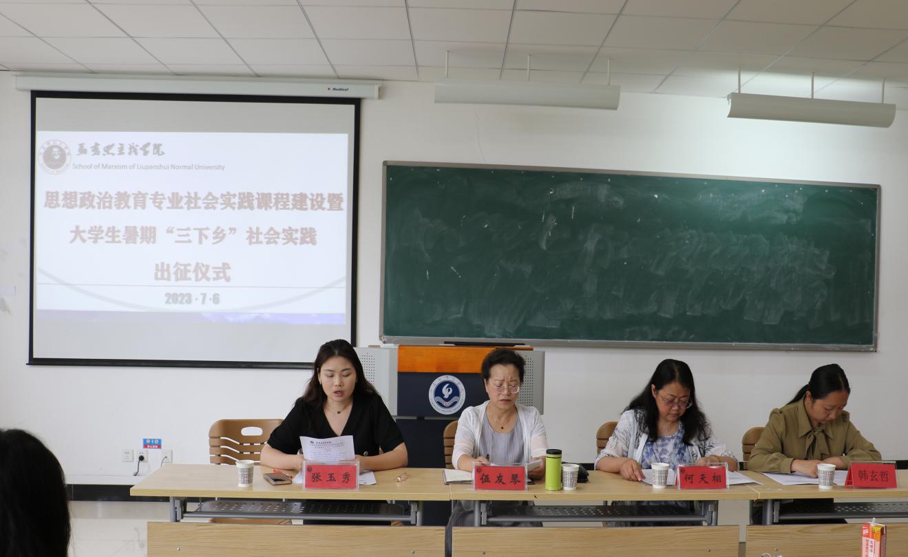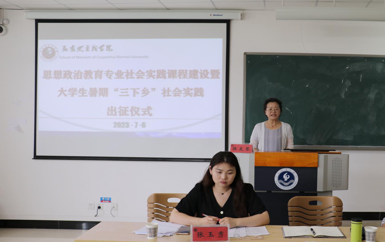 为深入贯彻落实党中央、团中央重要决策和习近平总书记系列重要讲话精神,7月6日上午,马克思主义学院在勤学楼301举行思想政治教育专业社会实践课程建设暨大学生暑期“三下乡”社会实践活动出征仪式,院党委书记何天栩、院长伍友琴教授出席,团委负责人韩玄哲、思想政治教育系副主任张玉秀及社会实践活动各团队指导教师参会,思想政治教育2021级全体学生、2022级部分学生到场。仪式由张玉秀主持。