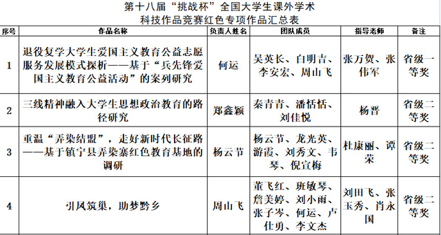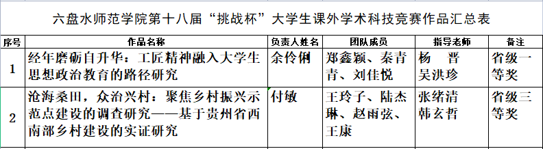 链接2:第十八届“挑战杯”全国大学生课外学术科技作品竞赛红色专项活动贵州省赛拟获奖名单公示:https://mp.weixin.qq.com/s?__biz=MzA3MzQwMzkwOQ==&mid=2651522136&idx=1&sn=3c2167afb181a04cb40d3fba9cea26e3&chksm=84f03f32b387b624837d79b124feaadbfda11190f334f89b30342a018fcaaf975e8ab5c5ef3c&mpshare=1&scene=23&srcid=0911phAK7cf9kTAKtZKEcRzB&sharer_shareinfo=0d84c1ae5b83d4b1e4ba2d3e2adb3393&sharer_shareinfo_first=e24293b4afbdf2b127fd7c2a8f58d17a#rd