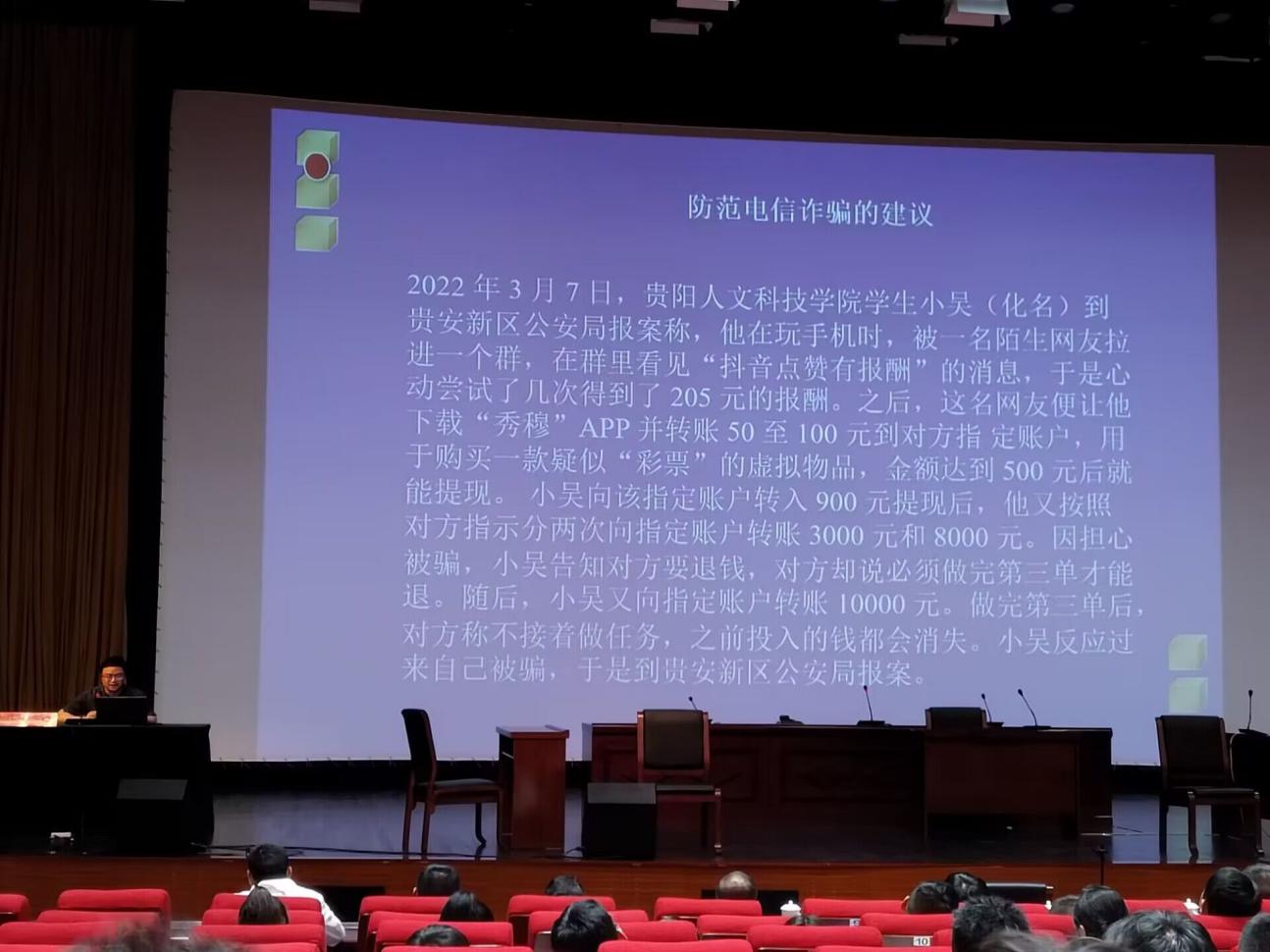 网络诈骗不仅仅给受害者带来财产和精神上的重大损失,还对互联网社会的信任、个人隐私保护、社会秩序等多个方面产生了深远的影响。通过以案说法专题讲座给全体师生带来了一场生动的讲座,增强师生的反诈意识和风险防范意识。