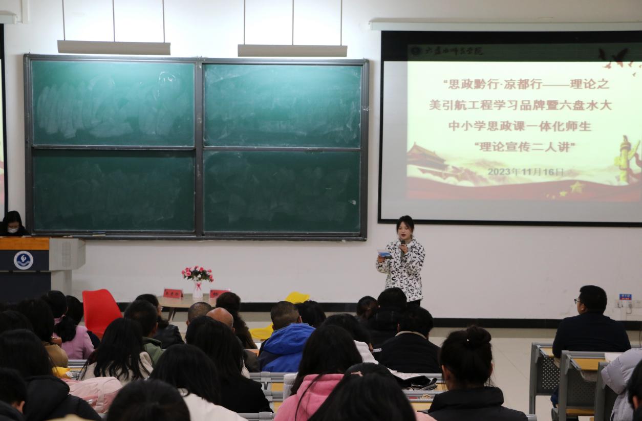 为推进党的二十大精神进校园,11月16日下午,“思政黔行·凉都行——理论之美”引航工程学习品牌暨六盘水大中小学思政课一体化师生“理论宣传二人讲”在勤学楼101教室顺利开展。bat365在线中国登录入口党委宣传部副部长张瑾、学院全体党员以及思想政治教育专业、历史学专业2021级全体学生聆听了宣讲。