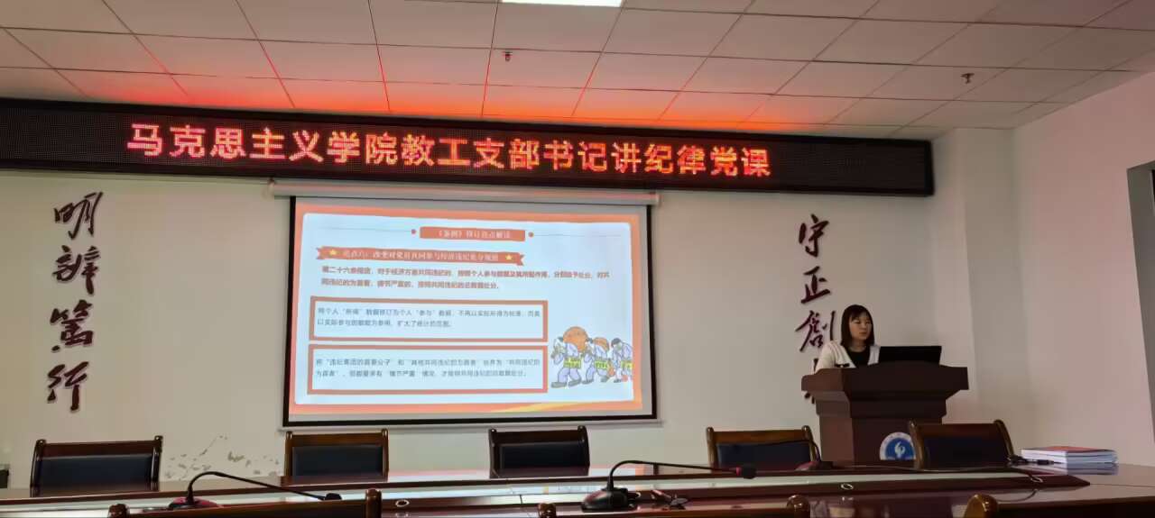 为扎实开展党纪学习教育,引导党员学纪、知纪、明纪、守纪,进一步强化纪律意识,5月30日,马克思主义学院教工党支部书记周楚婷以“学纪知纪明纪 做遵规守纪的明白人”为主题为支部全体党员讲授党纪学习教育专题党课。