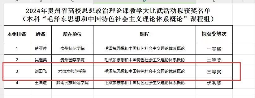 近日省教育厅公布了2024年贵州省高校思想政治理论课示范课和思想政治理论课教学大比武活动评选结果。示范课全省本科组共评奖项6个(一等奖1名,二等奖2名,三等奖3名),我院王炳艳老师的《读懂中国式现代化》拟获得三等奖。教学大比武活动全省本科组“毛泽东思想和中国特色社会主义理论体系概论”课程组共评奖项4个(一等奖1名,二等奖1名,三等奖1名,优秀奖1名),我院刘田飞老师主讲课程拟获得三等奖。