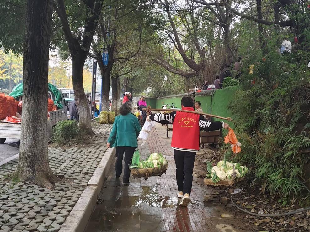 三个团支部分为两批进行社区志愿服务活动,第一批志愿者提醒商贩将货物摆放在相应位置,而非占用人行道,并帮助搬运货物。第二批志愿者在相应岔路口及市场内进行监督巡逻稳定市场秩序。