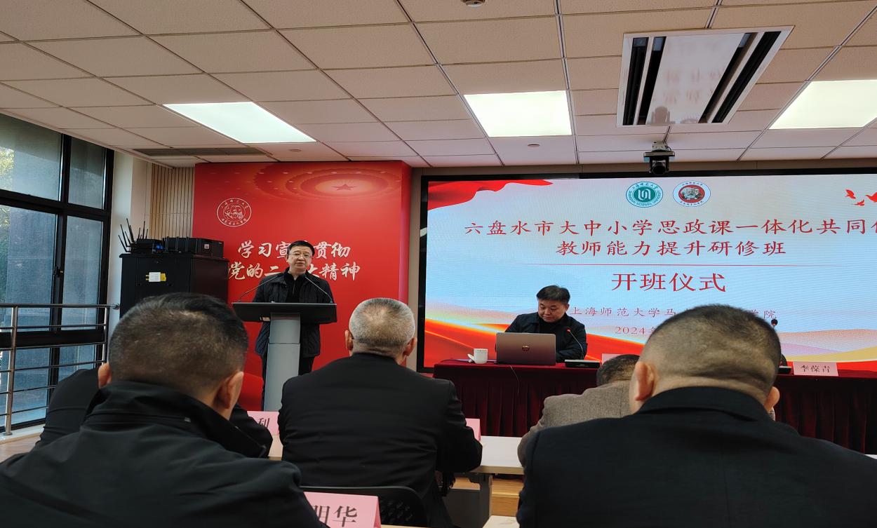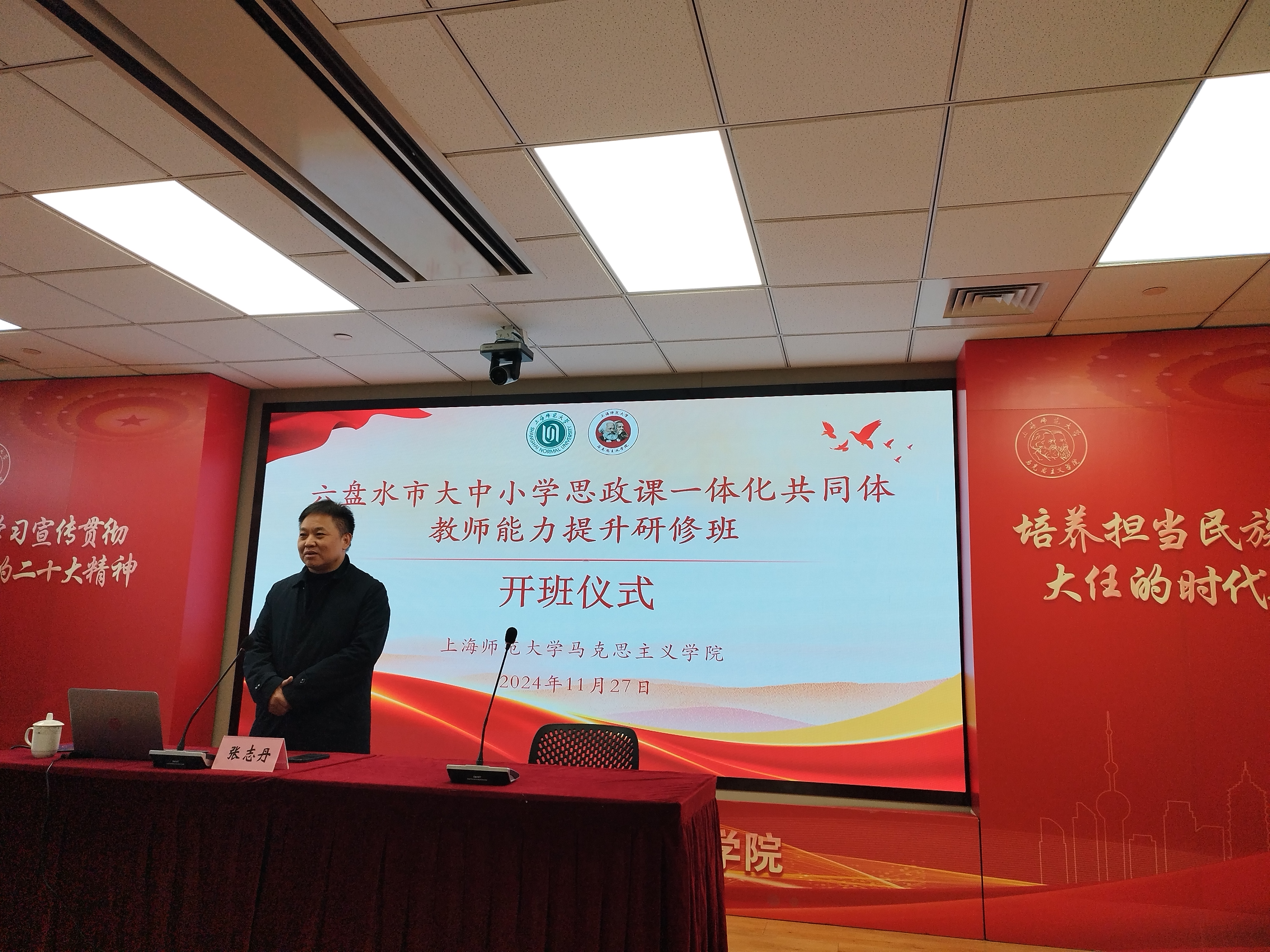 11月27日上午,六盘水市大中小学思政课一体化共同体教师能力提升培训班在上海师范大学马克思主义学院开班。bat365在线中国登录入口党委副书记李葆青教授,上海师范大学马克思主义学院院长张志丹教授,六盘水市教育局正县级干部、教育科学研究院负责人王廷云,bat365在线中国登录入口马克思主义学院党委书记杨永贵教授、副院长周才金出席,六盘水市大中小学思政课一体化共同体成员单位分管领导、思政课教师、工作人员30人参加开班式。