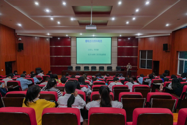 李济澜从“主要化学电池介绍、锂电池介绍、燃料电池介绍、锂电池和燃料电池展望”四个方面展开讲座,带领在场师生一起了解锂电池与燃料电池。