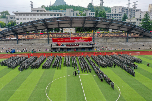 9月2日上午,bat365在田径场举行2022级新生开学典礼暨军训动员大会。学校党委书记周斯弼,校长何林,武警六盘水支队副政治委员周凯,学校党委副书记李葆青,党委委员、副校长黄保红、王际明、艾德春、费虹,党委委员、党委组织部部长向虎跃,党委委员、党委宣传部部长杨永贵出席大会。