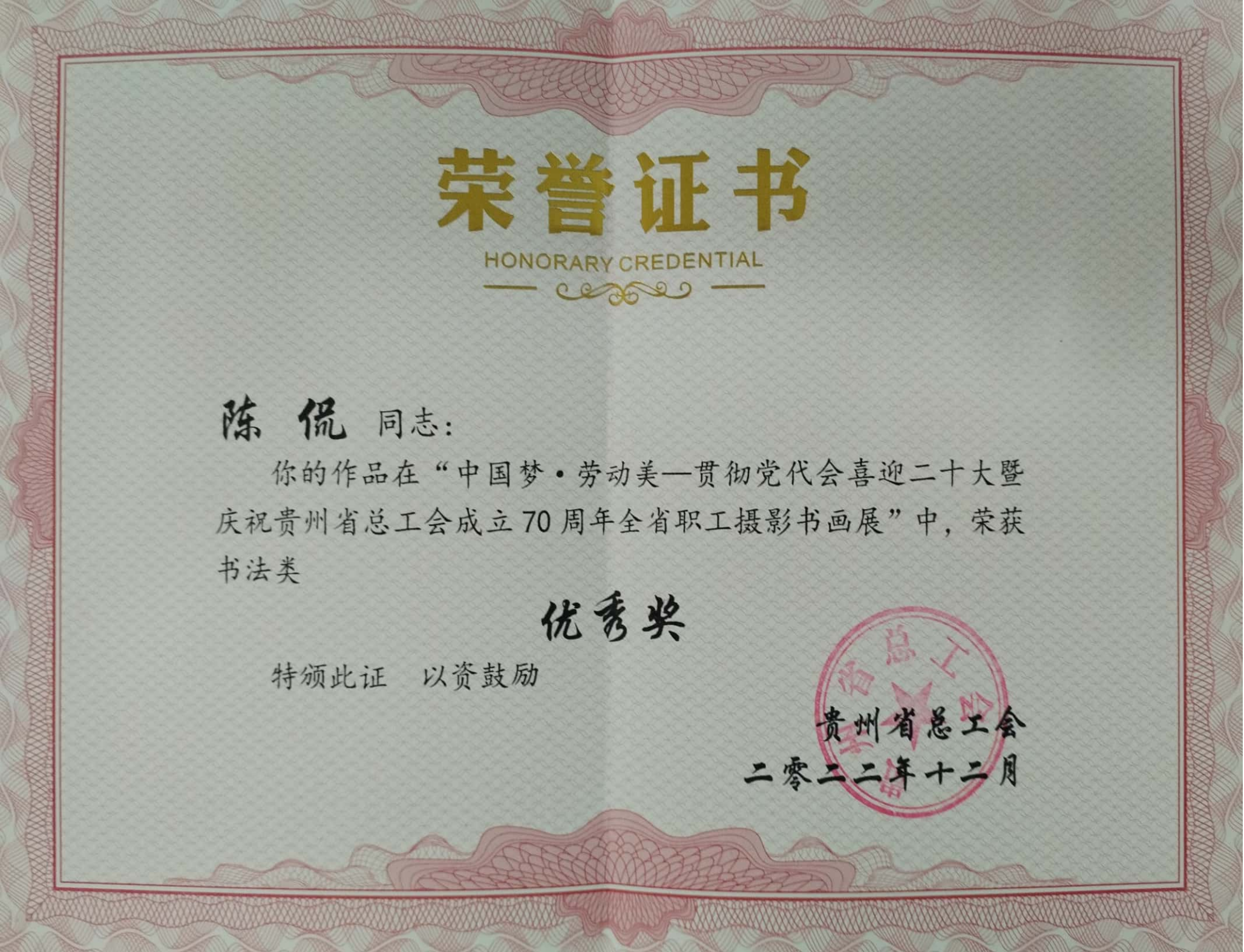 根据2022年贵州省总工会组织的“中国梦·劳动美——贯彻党代会喜迎二十大暨庆祝贵州省总工会成立70周年全省职工摄影书画展”评选结果,bat365文学与新闻学院教师陈侃荣获书法类优秀奖。