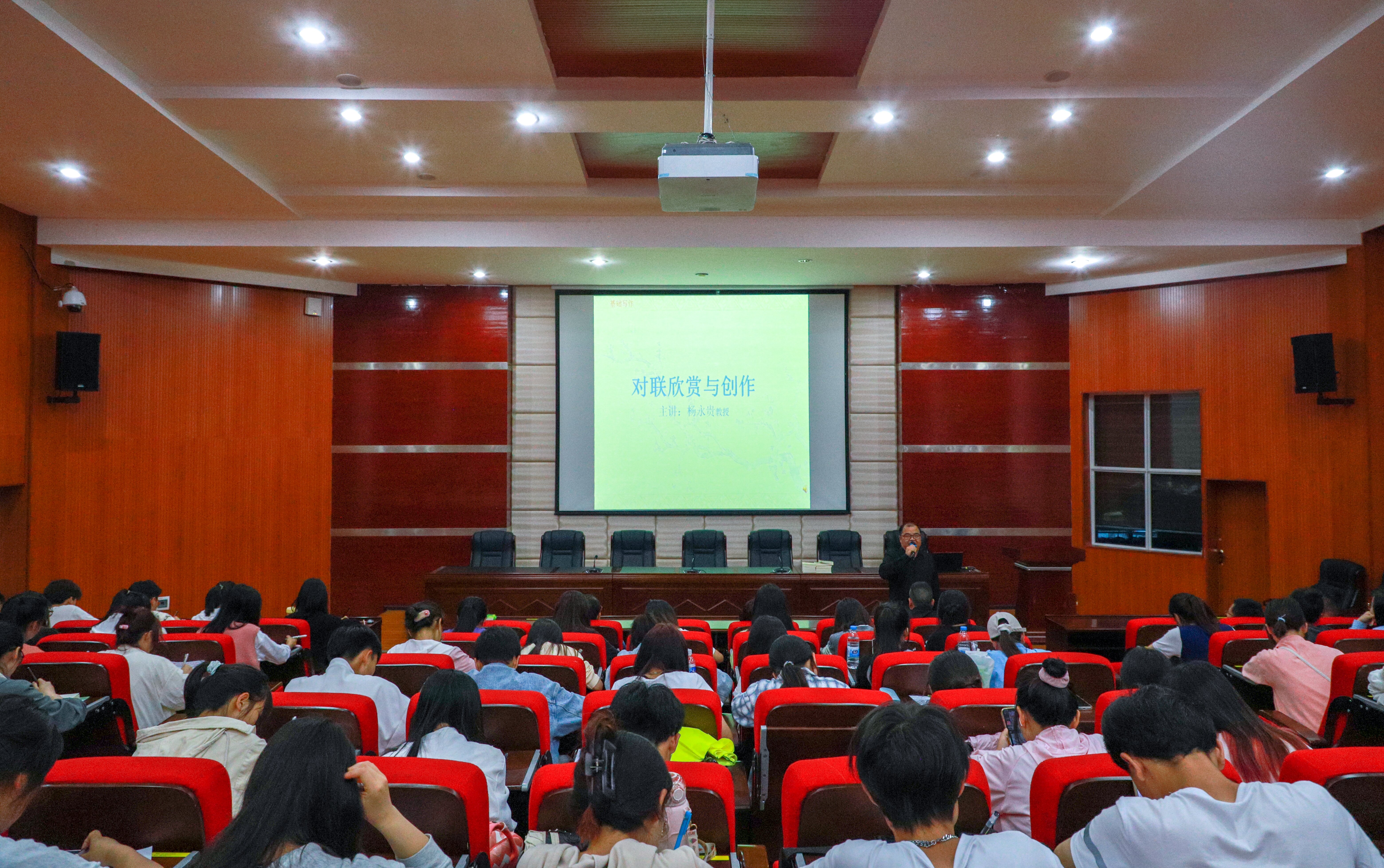 杨永贵从“对联的概念、历史、传统文化、基本特点、分类、赏析、对联写作的基本要求、忌讳”八个方面带领在场师生领略深藏于对联中的无穷韵味。