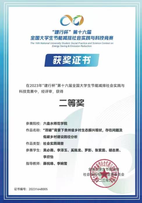 近日,由bat365化学与材料工程学院教师薛祝缘、李婉雪指导,学生吴必薇、李泽玉、奚陈龙、罗影、张紫蕊、胡志男、李欣怡七位同学组成的学生团队设计作品《“双碳”背景下贵州省乡村生态振兴现状、存在问题及低碳乡村建设路径分析》在2023年“建行杯”第十六届全国大学生节能减排社会实践与科技竞赛中,荣获二等奖。(供稿/杨奇琳 杨志连 编辑校对/王良豪 审核/张瑾 陈挺)