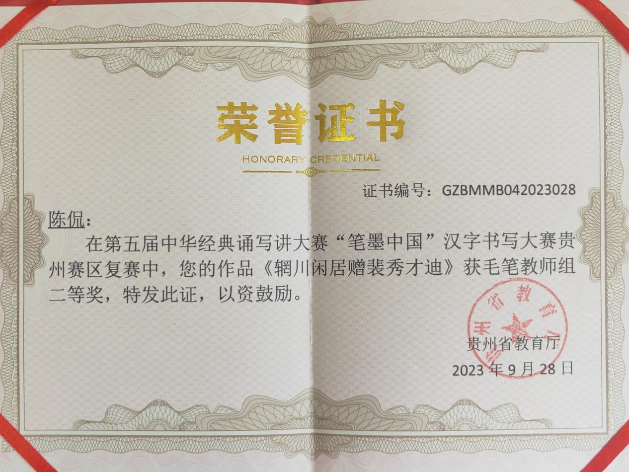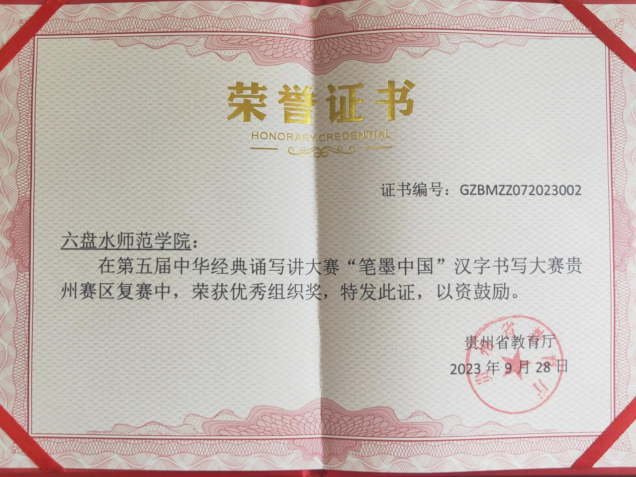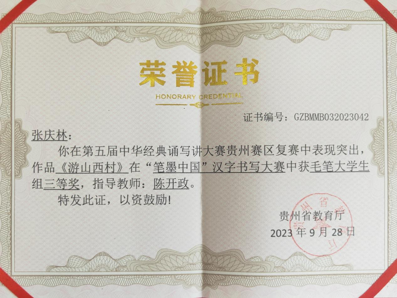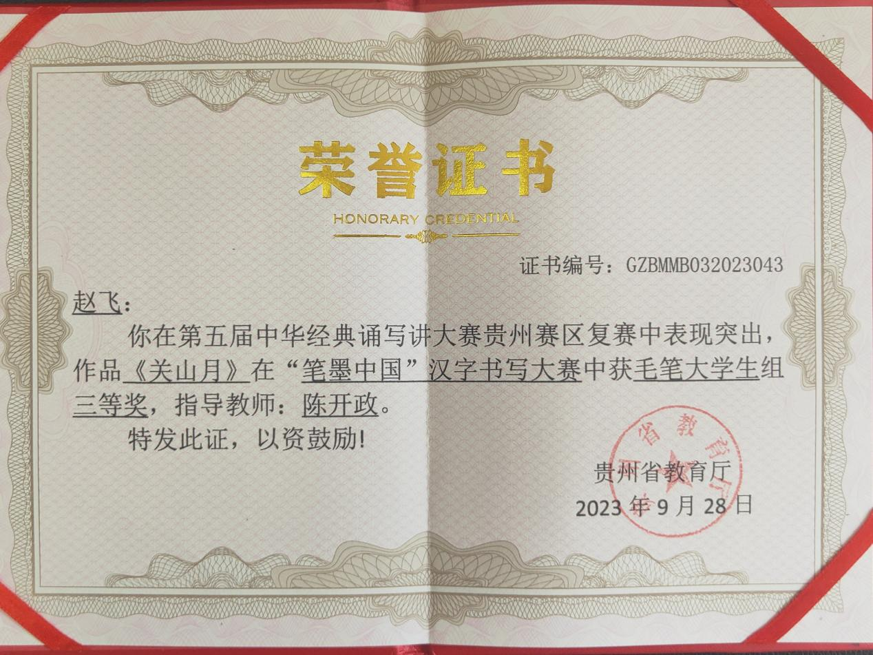 近日,贵州省教育厅公布第五届中华经典诵写讲大赛“笔墨中国”汉字书写大赛贵州赛区获奖信息,bat365在本次大赛中荣获全省优秀组织奖,文学与新闻学院指导教师陈侃、吴彩虹分别荣获毛笔字赛道教师组二等奖、三等奖,学生赵飞、张庆林分别荣获毛笔字赛道大学生组三等奖。