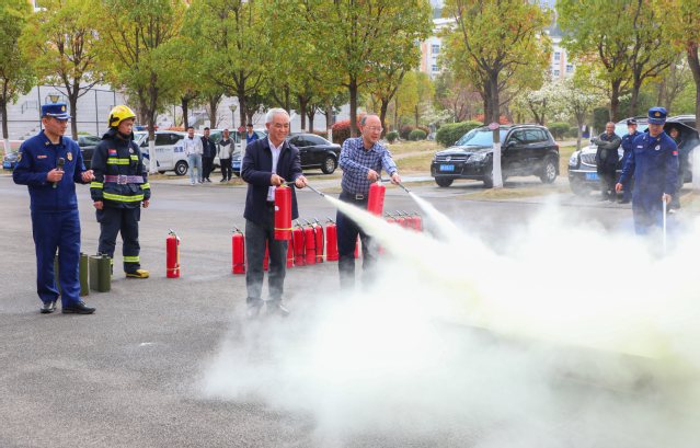 随后,参演人员在勤勉楼集合,参加灭火器实战演练。消防救援支队专业人员详细讲解消防基础知识和灭火器的使用方法,并现场演示灭火器的实战操作。在认真听讲及观摩后,各位领导和教职工亲身实践,面对熊熊燃烧的火焰,他们镇静从容、动作利落地按照灭火器的“一提二拨三握四压”使用要领将浓烟大火扑灭。