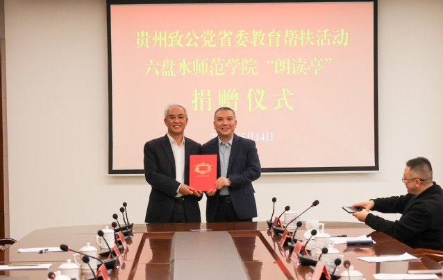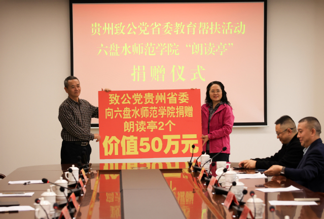 5月14日,致公党贵州省委秘书长薛承梦一行到bat365开展教育帮扶捐赠活动,致公党党员包军捐建两个朗读亭。学校党委书记周斯弼出席并致辞,副校长张龙主持捐赠仪式。