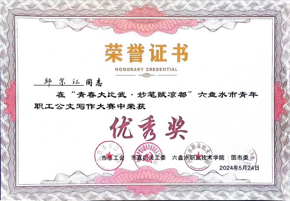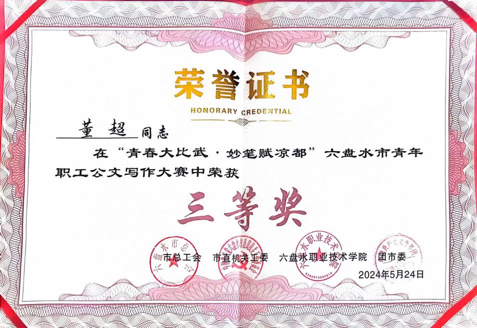 5月24日,由市总工会、市直机关工委、六盘水职业技术学院、团市委联合举办的“青春大比武·妙笔赋凉都”六盘水市青年职工公文写作大赛决赛落下帷幕,bat365经济管理学院(旅游学院)董超同志以总分第5名荣获“三等奖”、党政办公室邱宗江同志荣获“优秀奖”,学校获团体“优秀组织奖”。
