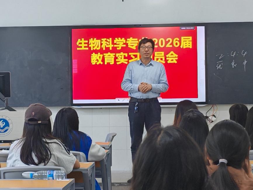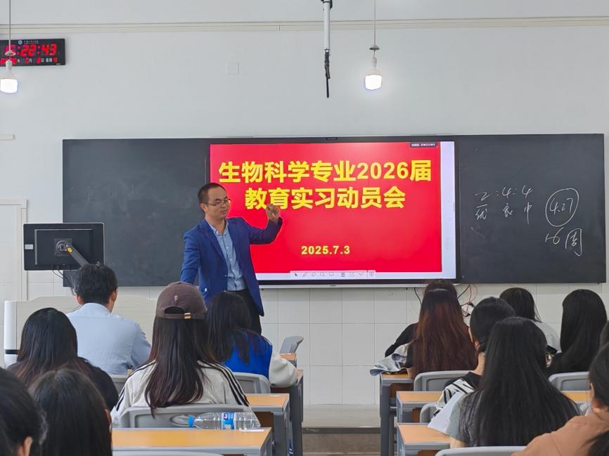 7月3日下午,我院生物科学专业2026届教育实习动员大会在博学楼103教室召开。会议由2026届生物科学专业班长班慧同学主持,2025-2026年度第一学期实习带队老师韩世明教授、2025-2026年度第二学期实习带队老师唐超智副教授及2026届生物科学专业全体同学参加。