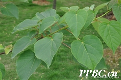 叶:叶薄革质或厚纸质,卵形或心状卵形,或为宽心形,先端渐尖或尾状,基部通常心形,边缘有粗的齿,齿尖有腺体,上面深绿色,光滑无毛,下面有白粉,沿脉有疏柔毛,脉腋有丛毛,基部脉腋更多,通常5基出脉,圆柱状,无毛,下部有2-4个紫色、扁平腺体,基部稍膨大。