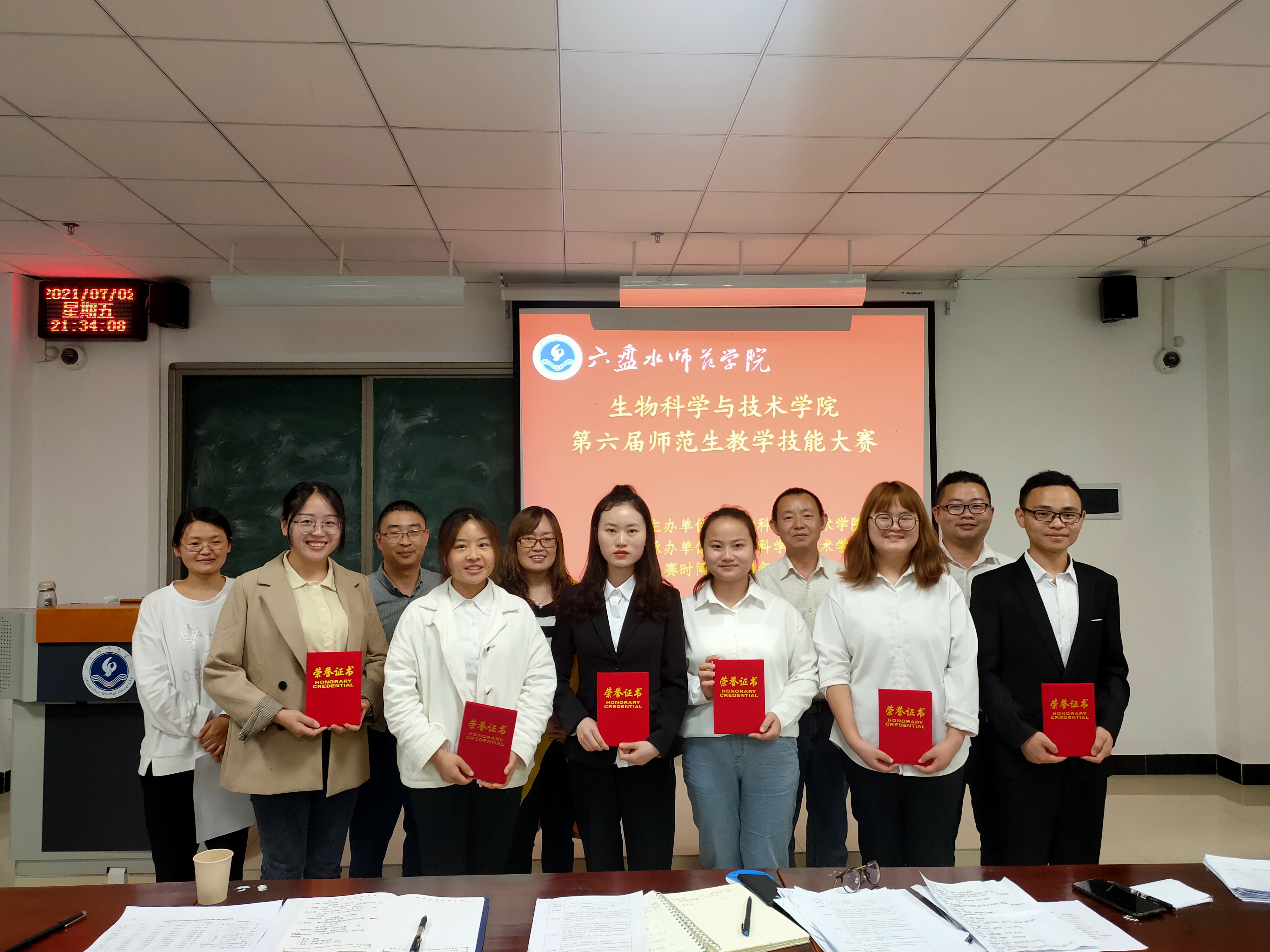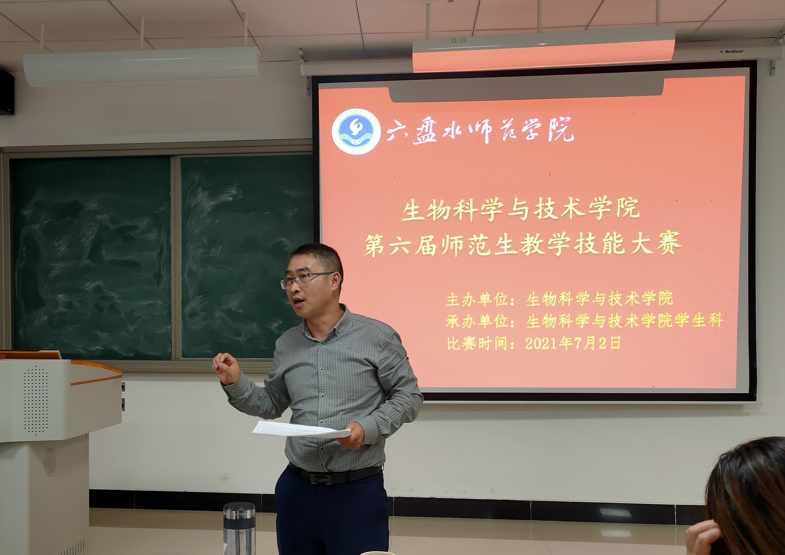 7月2日晚上,生物科学与技术学院在奥学楼208教室举办第六届师范生教学技能大赛。学院院长杨友联,党委副书记匡其羽,教师张桂梅、黄倩、王应权担任评委。学院学生会主席聂燕主持。