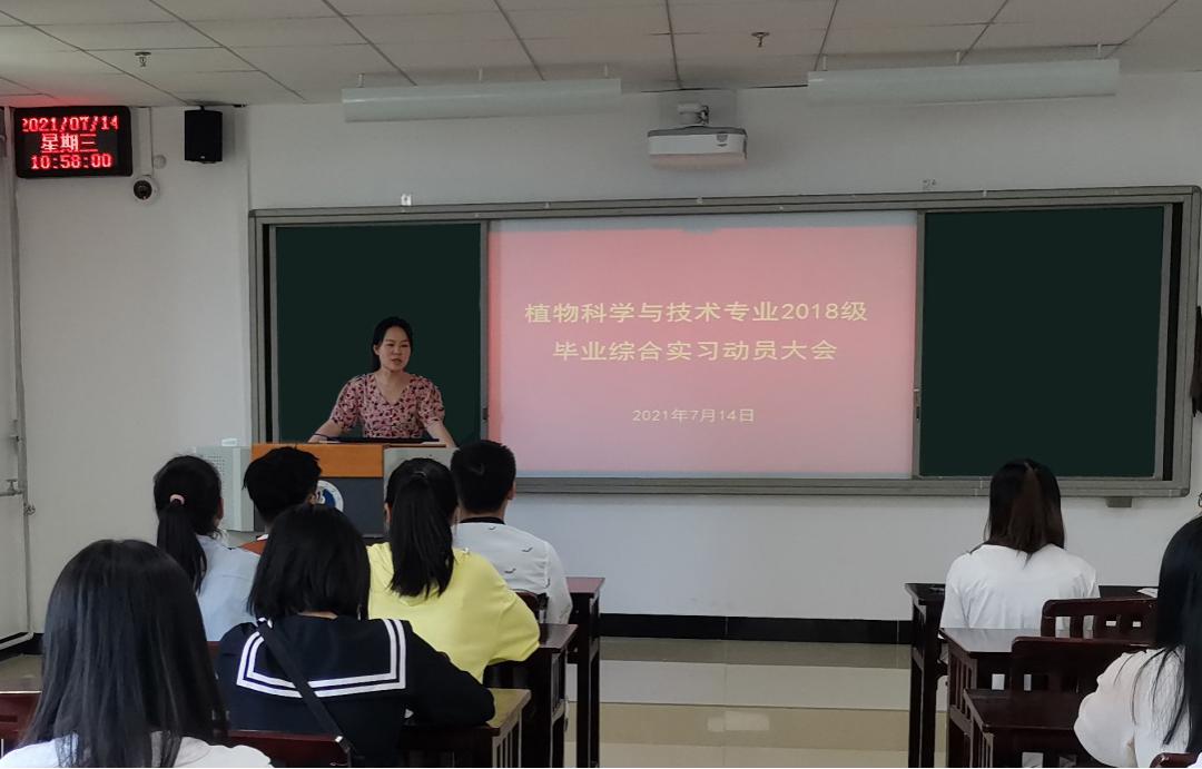 为做好实习动员工作,保证实习质量,使实习工作有序开展。7月14日,生物科学与技术学院植物科学与技术专业在奥学楼315教室召开2018级毕业综合实习动员大会。大会由植物科学系主任郭丽娜主持,学院副院长方玉梅出席,教学科研科科长陈志霞及2018级植物科学与技术专业全体学生参加。