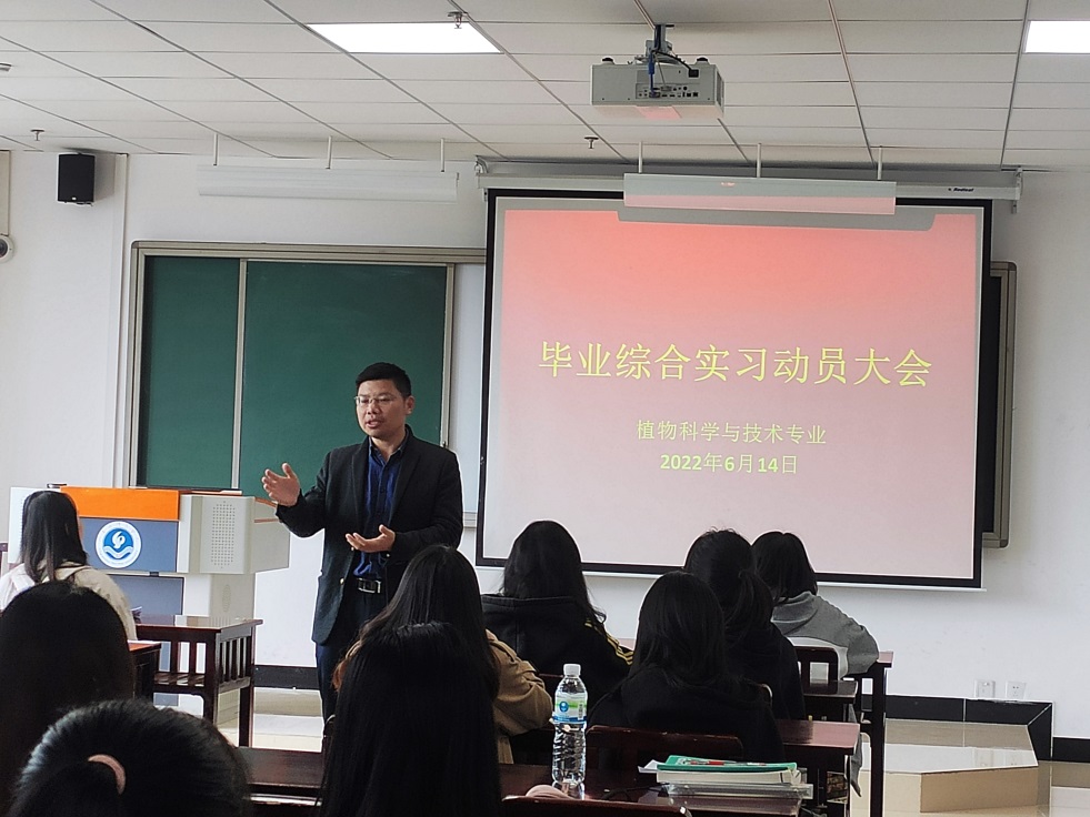为做好2019级学生毕业综合实习工作,引导学生完成实习前各项准备,保障实习工作顺利开展。6月14日中午,生物科学与技术学院植物科学系在奥学楼A305教室召开毕业综合实习动员大会。学院院长熊荣川出席,植物科学系主任郭丽娜、副教授韩世明及植物科学与技术专业2019级全体学生参加。