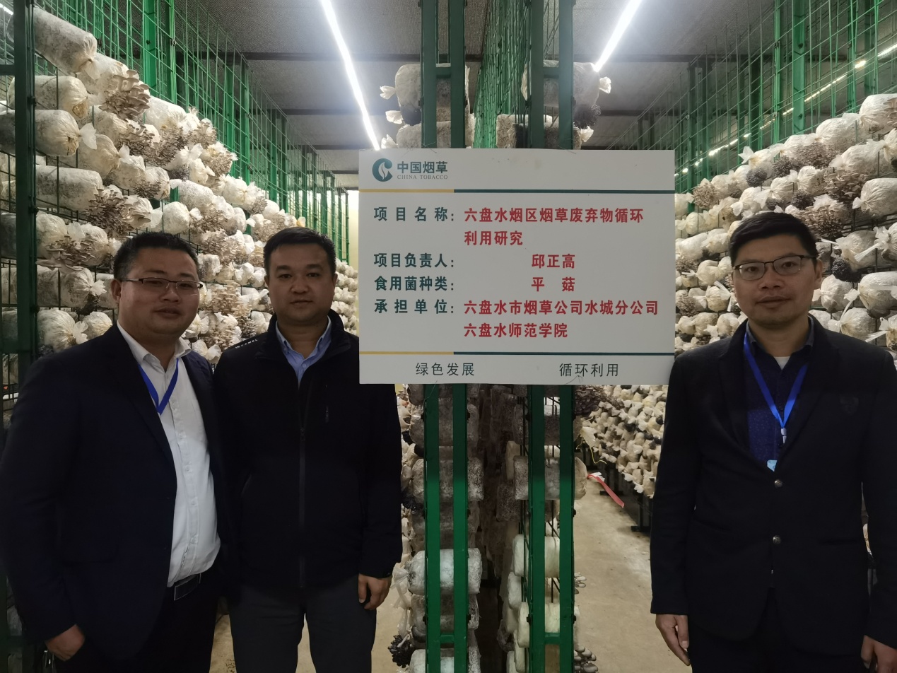 10月8日中午,生物科学与技术学院院长熊荣川与市烟草公司经理王仕海、马莹,办公室主任邱正高,水城分公司经理黄正平等组成专家组到水城区盐井乡群福村群福食用菌种植工厂对“六盘水烟区烟草废弃物循环利用研究”项目进行现场验收。项目组成员、学院教师匡其羽、李树江陪同。