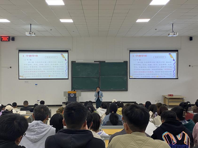 11月11日下午,生物科学与技术学院在勤学楼Q201阶梯教室开展学籍管理、第二课堂和校纪校规教育。学院教学科研科科长陈志霞、学生科科长陈艳艳以及辅导员杨乐到场宣讲,2022级全体新生参加。会议由陈艳艳主持。